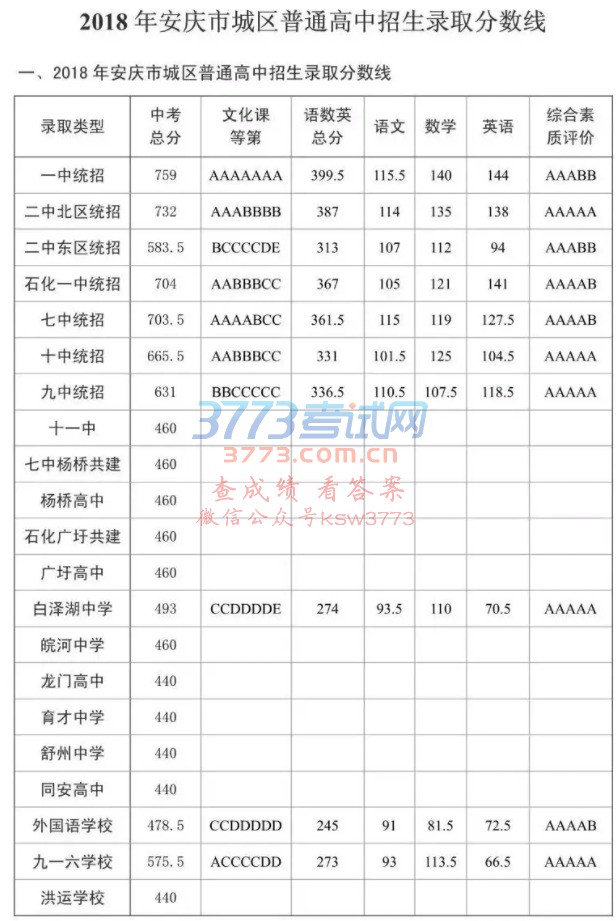 发布《2018年安庆市城区普通高中招生录取分数线》