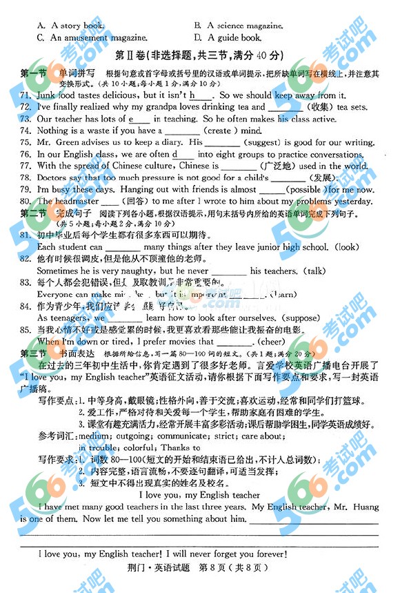 精英中考网消息:2017年湖北省荆门市中考已经结束,很快又将一批新的初三考生即将参加2018荆门中考,为了帮助广大师生更好的备考,小编收集整理了2017荆门中考试题及参考答案,供广大考生参考,下面是2016荆门中考英语试卷试题及参考答案