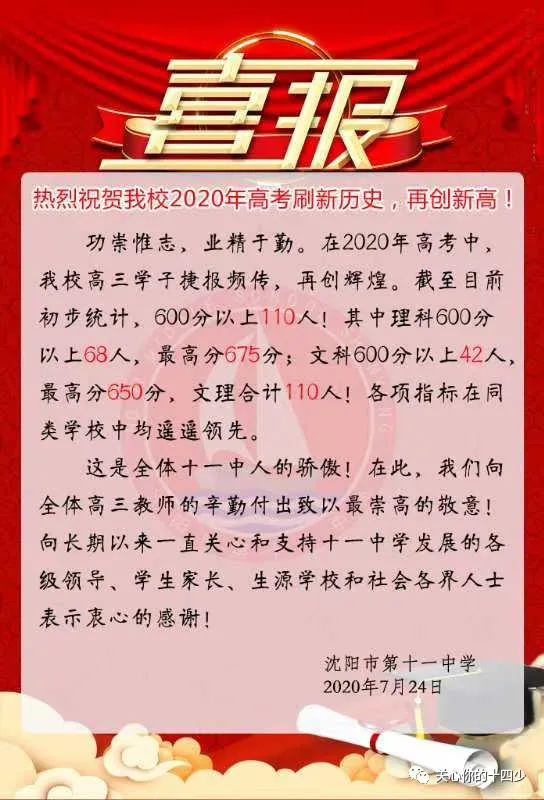 2020沈阳十一中高考喜报成绩、本科一本上线人数情况