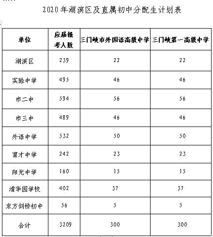 第一志愿(9所招生学校):三门峡市外国语高级中学(400人)、三门峡第一高级中学(300人)、三门峡高新一中(100人)、义马市高级中学(300人)、渑池县高级中学(300人)、陕州中学(300人)、灵宝市第一高级中学(300人)、灵宝市实验高级中学(300人)、卢氏县第一高级中学(300人)。