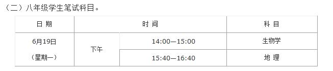 八年级学生信息技术上机操作考试和生物学实验操作考试在5月份完成。九年级学生物理和化学实验操作考试在5月份完成。九年级学生体育与健康现场考试在5月份完成。