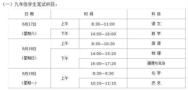 九年级学生考试笔试科目:语文、数学、英语、物理、道德与法治、化学、历史,共7科7卷。其中,道德与法治实行开卷笔试,其他科目均为闭卷笔试。笔试科目的语文科目为一卷制,其他科目为两卷制。各科目试卷满分值及考试时长分别为:语文120分,考试时长150分钟;数学120分,考试时长120分钟;英语120分(其中听力30分),考试时长120分钟;物理80分,考试时长80分钟;道德与法治80分,考试时长80分钟;化学60分,考试时长60分钟;历史60分,考试时长60分钟。